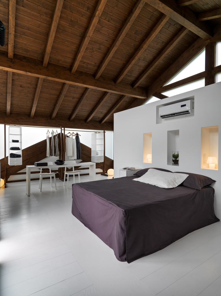 La doppia altezza della zona giorno, con le capriate lignee a vista, dialoga con il bianco ottico degli interni e il nero assoluto della pietra esterna, in un gioco di contrasti in cui però tutto risulta in equilibrio, avvolto da un’atmosfera rarefatta che invita al relax.