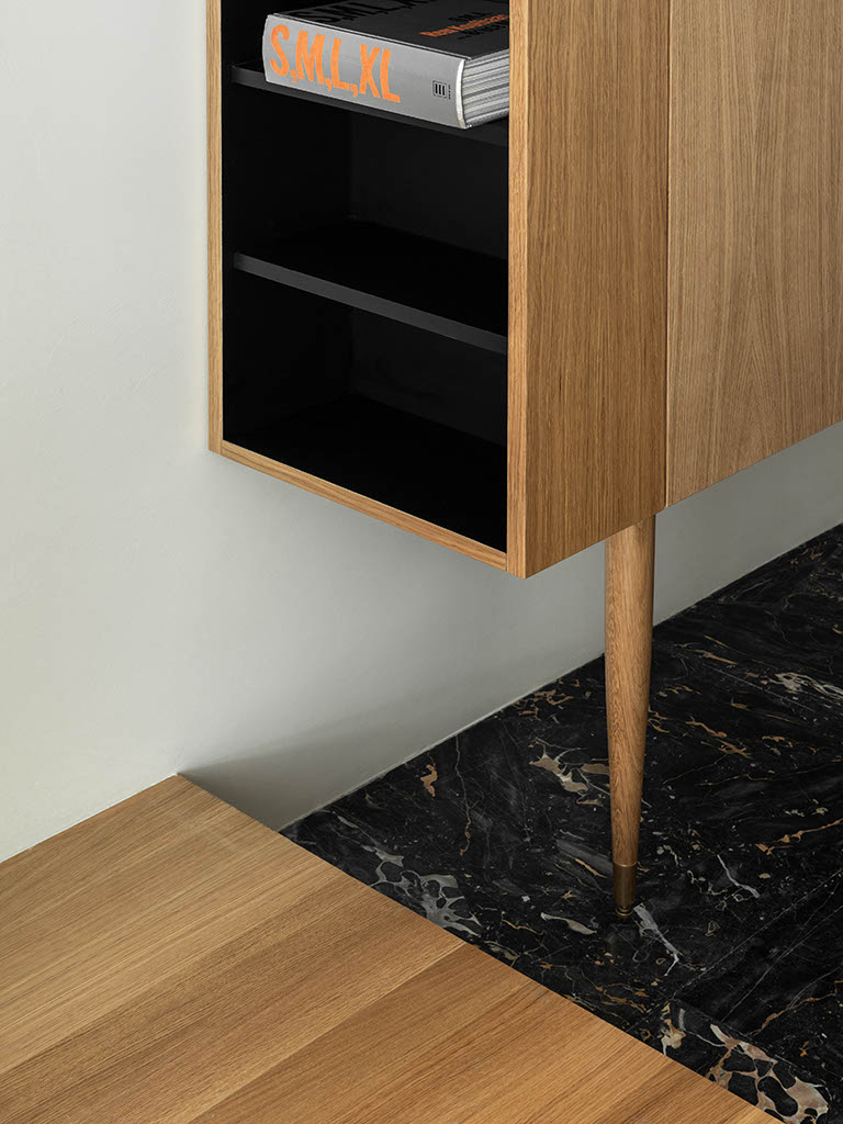 Superato l’ingresso, il progetto introduce una nuova quota di camminamento, resasi necessaria per l’integrazione dei nuovi impianti compreso il sistema radiante a pavimento: per la nuova superficie si opta per un rivestimento in doghe di rovere di piccolo formato, dalla calda vocazione domestica. La posa dritta accostata crea un effetto geometrico ordinato e rigoroso per un pavimento che non ruba la scena, ma la incornicia con discrezione.