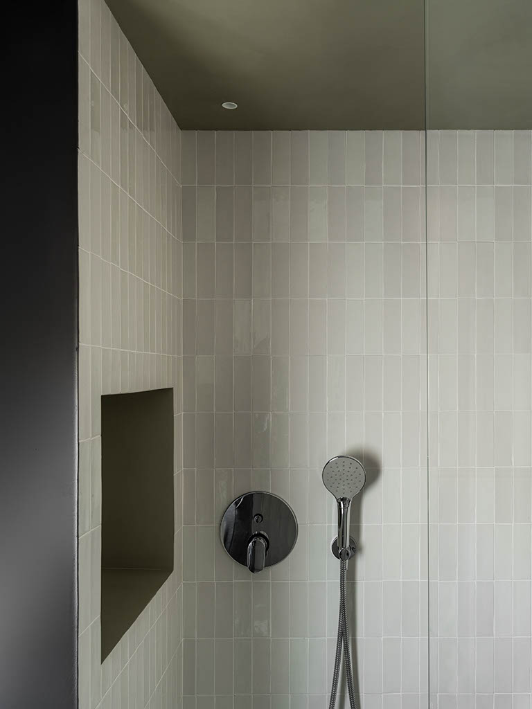 Per le finiture superficiali di alcuni tratti di pareti la scelta ricade su resine ecologiche (Arteviva) dai toni delicati, una reinterpretazione contemporanea del design italiano degli anni ’60: la palette tenue si confronta con la ruvida presenza della struttura a vista, costruendo un equilibrio misurato tra memoria e attualità.